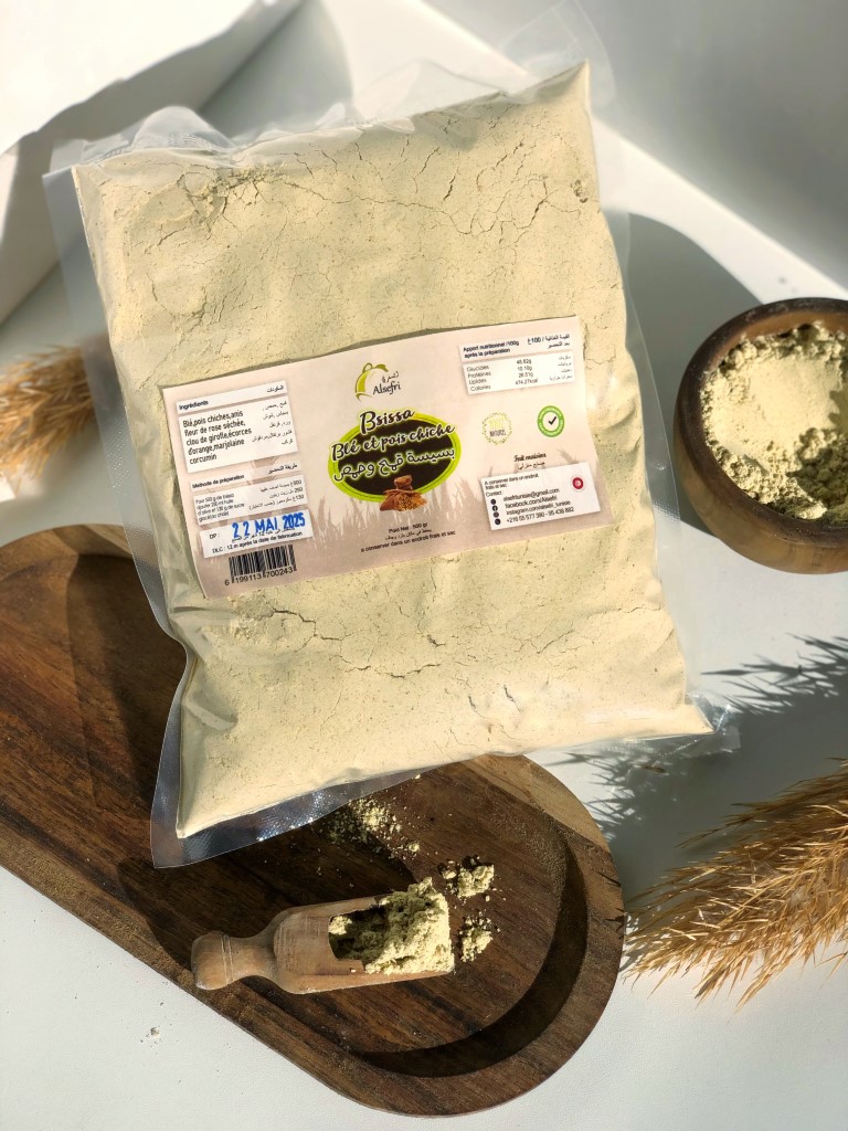 Redécouvrez le goût authentique de la tradition avec notre Bsissa artisanale à base de blé et pois-chiche. Torréfiée et finement moulue selon les méthodes ancestrales tunisiennes, cette bsissa offre un concentré de fibres, protéines végétales et minéraux essentiels pour une alimentation équilibrée. Naturellement rassasiante, elle se consomme facilement en pâte (avec huile d’olive ou lait) ou en boisson, chaude ou froide.